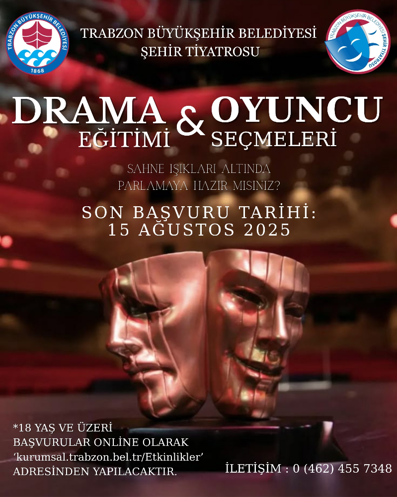Trabzon Büyükşehir Belediyesi Şehir Tiyatrosu, 2025-2026 tiyatro sezonunda sahnelenecek oyunlarda rol alacak yeni yetenekleri keşfetmek amacıyla oyuncu seçmeleri düzenliyor. Aynı zamanda, tiyatroya ilgi duyan bireylerin gelişimini desteklemek için kapsamlı bir drama eğitimi programı da hayata geçirilecek. Oyuncu seçmelerine katılmak isteyen adayların 18 yaşını doldurmuş olmaları gerekiyor. Seçmeler için son başvuru tarihi 15 Ağustos 2025 olup, başvurular online olarak 'kurumsal.trabzon.bel.tr/Etkinlikler' adresi üzerinden yapılacak.