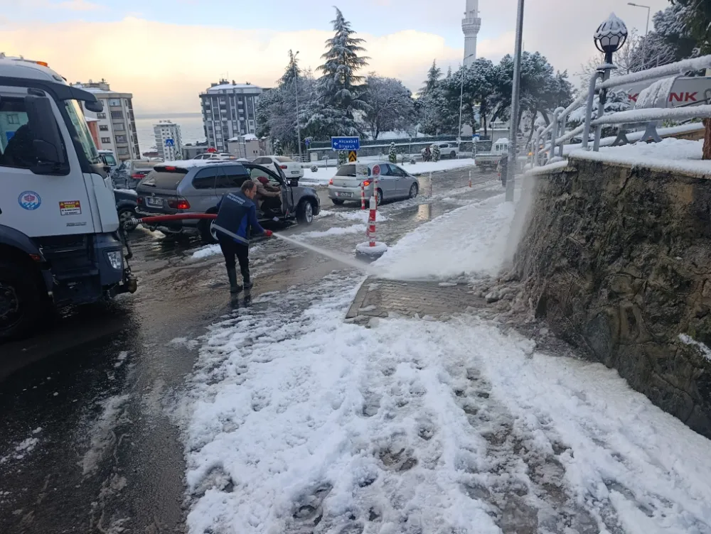 Trabzon Büyükşehir Belediyesi ekipleri, gece etkili olan kar yağışının ardından şehir merkezinde kar temizleme seferberliği başlattı. Günün ilk ışıklarıyla birlikte sahaya çıkan ekipler, yaya ve araç trafiğinin aksamaması için yoğun çaba harcıyor.