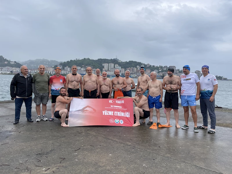 Rize Limanı'nda bir araya gelen, aralarında 67 yaşındaki eski Rize Belediye Başkanı Halil Bakırcı'nın da bulunduğu grup, 15 Temmuz Yüzme Etkinliği'ne katıldı.