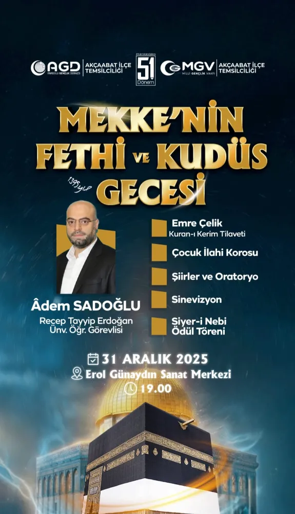 31 Aralık Çarşamba akşamı saat 19.00’da Erol Günaydın Sanat Merkezi’nde düzenlenecek olan programın içeriğinde Kur’an ziyafeti, çocuk ilahi korosu, şiir dinletisi, oratoryo ve sinevizyon gösterimi olacak. Ayrıca Recep Tayyib Erdoğan Üniversitesi öğretim görevlisi Âdem Sadoğlu “Fetih ve Kudüs” konulu konuşma yapacak.