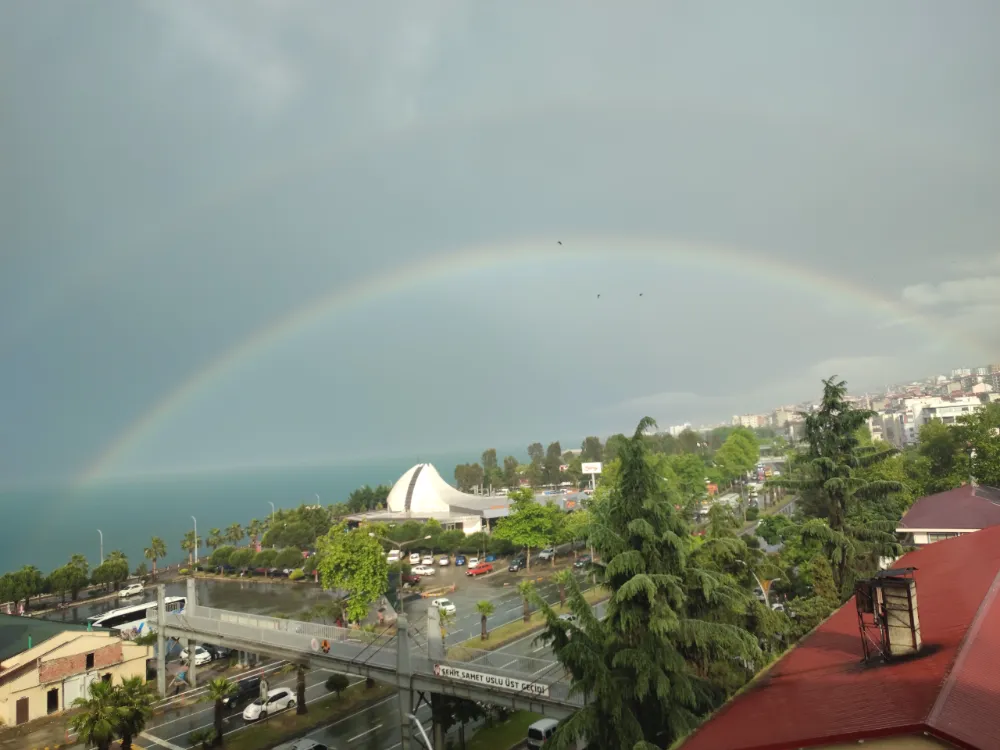 Akçaabat'ta meydana gelen yağışın ardından gökyüzünde beliren gökkuşağı, doğanın muhteşem bir görsel şölenine dönüştü. Renk cümbüşüyle gözleri kamaştıran gökkuşağı, çevredeki insanların ilgi odağı oldu. Doğanın sunduğu bu eşsiz manzara, vatandaşların kameralarına yansıdı.
