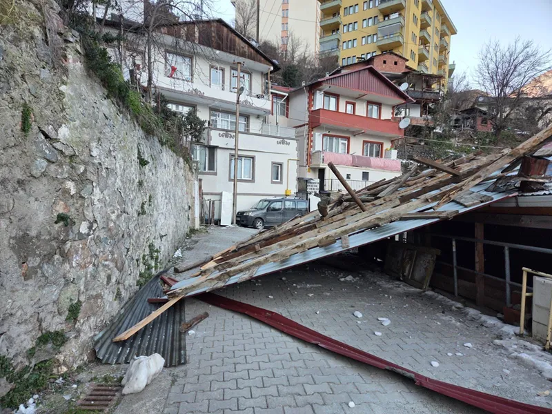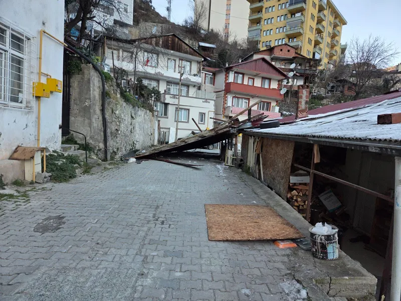 İhbar üzerine bölgeye sevk edilen belediye ekiplerince çatı parçaları bulunduğu yerden kaldırıldı.