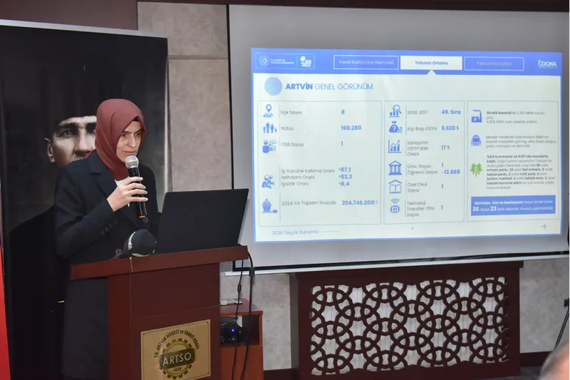 DOKA Artvin Yatırım Destek Ofisi Uzmanı Fatma İpek de programın usul ve esasları ile Artvin'in potansiyeline yönelik sunumu gerçekleştirdi.