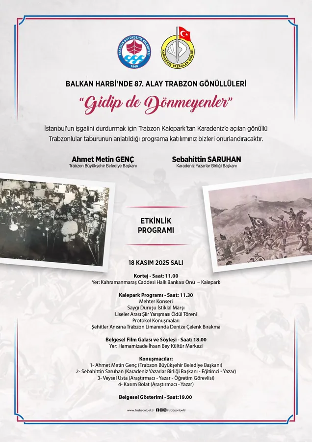 Trabzon Büyükşehir Belediyesi ve Karadeniz Yazarlar Birliği iş birliğinde, Balkan Harbi sırasında 87. Alay bünyesinde yer alan Trabzon Gönüllüler Taburu’nun 511 şehidini anmak amacıyla 'Gidip de Dönmeyenler' adlı etkinlik düzenlenecek. Trabzon Gönüllüler Taburu’nun İstanbul’un işgalini durdurmak için deniz yoluyla savaşa uğurlandığı Kalepark’ta gerçekleştirilecek program, 18 Kasım 2025 Salı günü (yarın) saat 11.00’de Kahramanmaraş Caddesi’nden Kalepark'a gerçekleştirilecek kortej yürüyüşü ile start alacak. Kalepark’taki anma programı ve Trabzon Limanı'nda denize şehitler anısına çelenk bırakılmasının ardından saat 18.00'de Hamamizade İhsan Bey Kültür ve Sanat Merkezi’nde, Büyükşehir Belediye Başkanı Ahmet Metin Genç, Karadeniz Yazarlar Birliği Başkanı Sebahattin Saruhan ile araştırmacı yazarlar Veysel Usta ve Kasım Bolat'ın konuşmacı olarak katılacağı söyleşi gerçekleştirilecek. Saat 19.00'da ise 'Gidip de Dönmeyenler' adlı belgeselin gösterimi yapılacak.