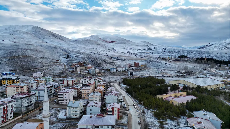 Karın ardından beyaz örtüyle kaplanan yerleşim yerleri ve dağlar dronla görüntülendi.