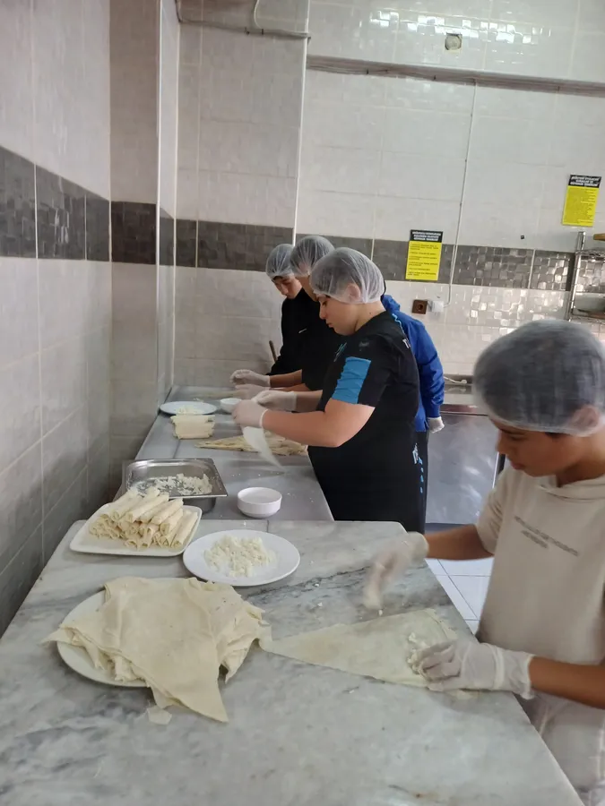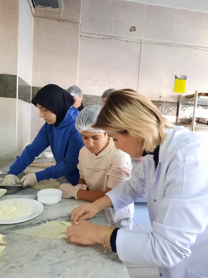 Eğitimin devamında öğrenciler el becerilerini geliştirme fırsatı bularak mutfak uygulamalarına geçti. Kalem böreği ve kek yapımında hem keyifli hem öğretici bir süreç yaşayan gençler, hazırladıkları ürünleri kurs sonunda birlikte tadımlayarak mutfak kültürünün paylaşım yönünü deneyimledi.
