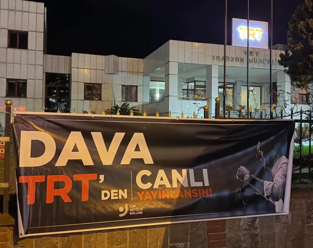 Marmara Ceza İnfaz Kurumu Yerleşkesi’nde görülecek ilk duruşma öncesi, CHP Trabzon İl ve İlçe örgütleri, Akçaabat’ın Söğütlü Mahallesi’nde bulunan TRT Trabzon Müdürlüğü binası önüne bir afiş astı.