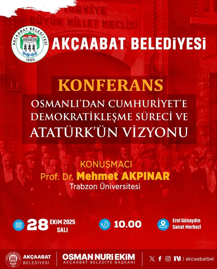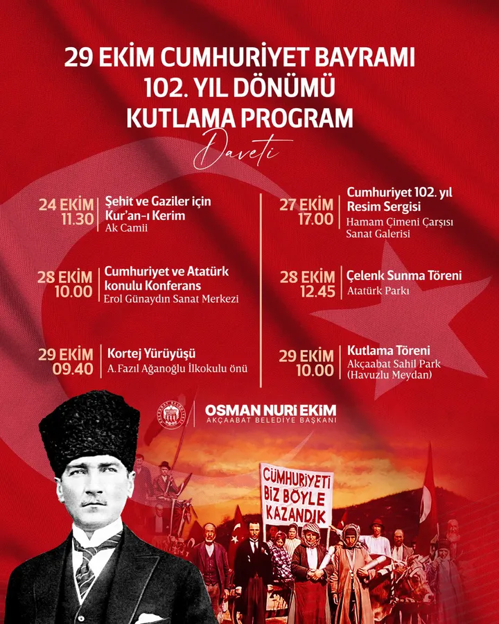 Akçaabat Belediye Başkanı Osman Nuri Ekim, Cumhuriyet Bayramı dolayısıyla yaptığı açıklamada şunları söyledi: “Cumhuriyet, bize atalarımızdan miras kalan en kıymetli değerdir. Bu emaneti yaşatmak, güçlendirmek ve gelecek nesillere daha güçlü şekilde aktarmak hepimizin ortak sorumluluğudur. Cumhuriyetimizin 102. yılını, milletçe büyük bir gurur ve coşkuyla kutluyoruz. Tüm hemşehrilerimizi bu anlamlı programa davet ediyorum.”