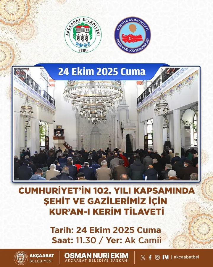 Cumhuriyet kutlamaları, 24 Ekim Cuma günü saat 11.30’da Ak Camii’nde şehitler ve gaziler için düzenlenecek Kur’an-ı Kerim tilavetiyle başlayacak.