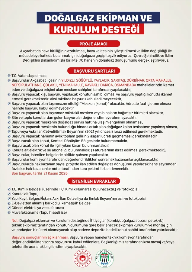 “Hava Kalitesinin İyileştirilmesi Projesi” kapsamında, ilçede yaşayan dar gelirli 70 ailenin doğalgaza geçişi için ekipman ve kurulum desteği sağlanacak. Proje ile birlikte Akçaabat’ta katı yakıt kullanımının azaltılması, hava kirliliğinin önüne geçilmesi ve vatandaşların daha sağlıklı yaşam koşullarına kavuşması hedefleniyor. Belediye tarafından karşılanacak destek kapsamında, doğalgaz tesisatı, proje çizimi, kombi, radyatör ve montaj giderleri ücretsiz olarak karşılanacak.