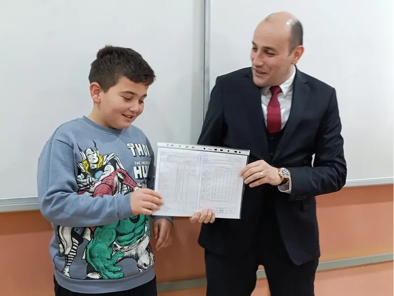 İlçe Kaymakamı Ahmet Kavanoz, Şehit Hüseyin Tahmaz İlkokulu'nda organize edilen programda, öğrencilere karne dağıttı.