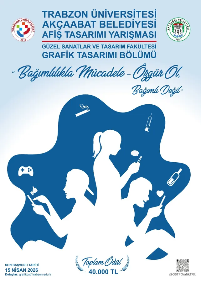 Trabzon Üniversitesi ve Akçaabat Belediyesi iş birliğiyle, Güzel Sanatlar ve Tasarım Fakültesi Grafik Tasarımı Bölümü tarafından “Bağımlılıkla Mücadele – Özgür Ol, Bağımlı Değil” temalı bir afiş tasarımı yarışması düzenlenecek.