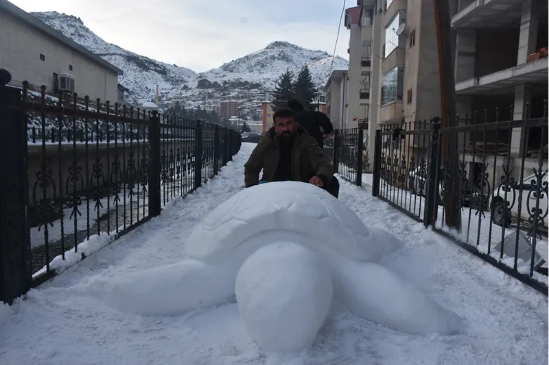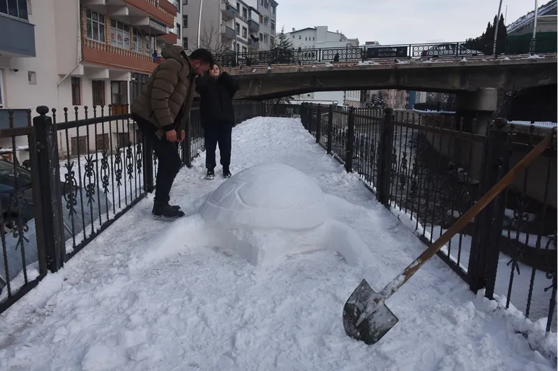 Oral, kentte etkili olan soğuk hava ve kar yağışının ardından Hasanbey Mahallesi Cumhuriyet Caddesi'ndeki yürüyüş yolu üzerinde kardan kaplumbağa yapma kararı aldı.