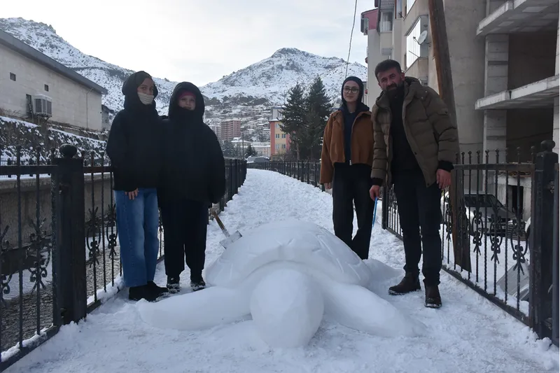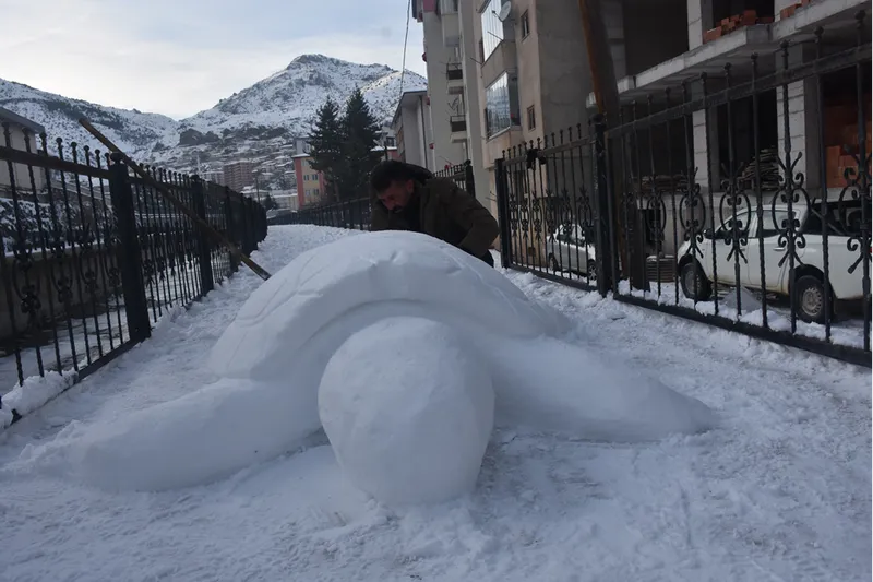 Kürek ve plastik ürünlerle kardan kaplumbağa yapan Oral, çevredeki vatandaşların da beğenisini kazandı.