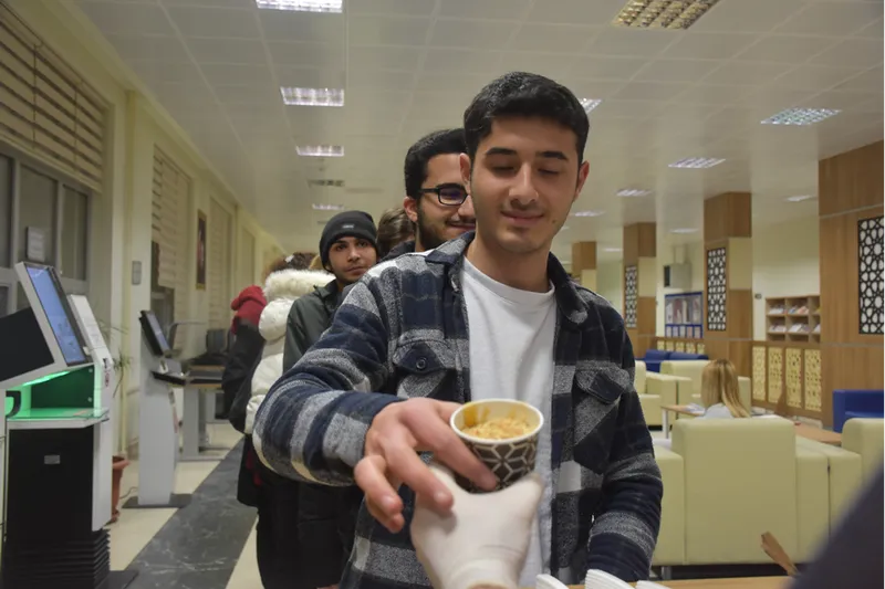 Ömer Hamza Ayhan da kütüphanede ders çalıştıklarını belirterek, "Rektör hocamız da bize herle ikram etti. Bu soğukta içimizi ısıttı." diye konuştu.