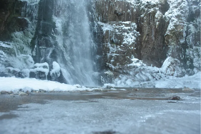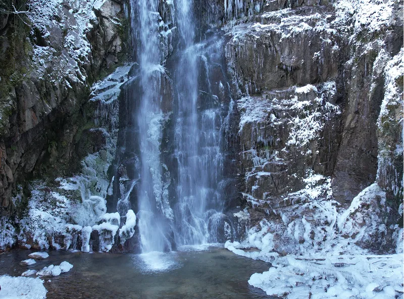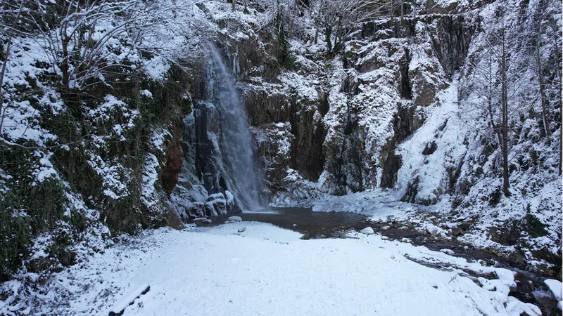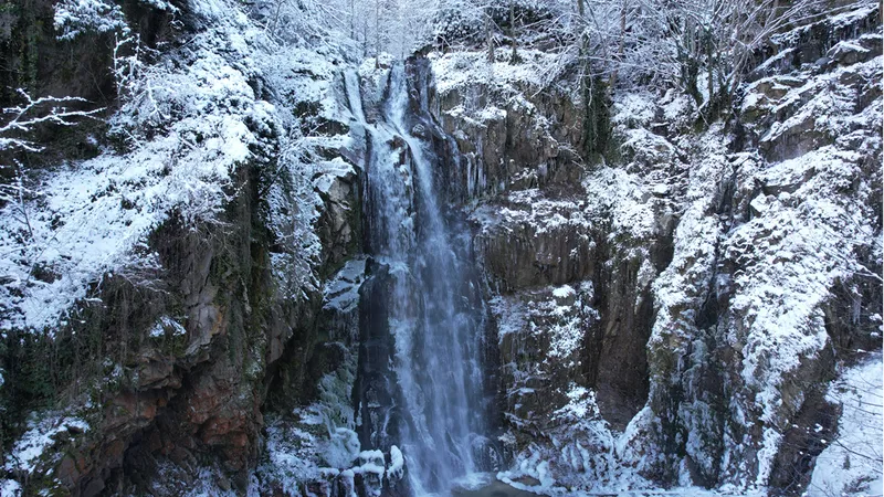 GÜMÜŞHANE (AA) - Gümüşhane'de Örümcek Ormanları'nın içinden doğup 15 metreden dökülen Çağlayandibi Şelalesi, karın ardından beyaz örtüyle kaplandı.