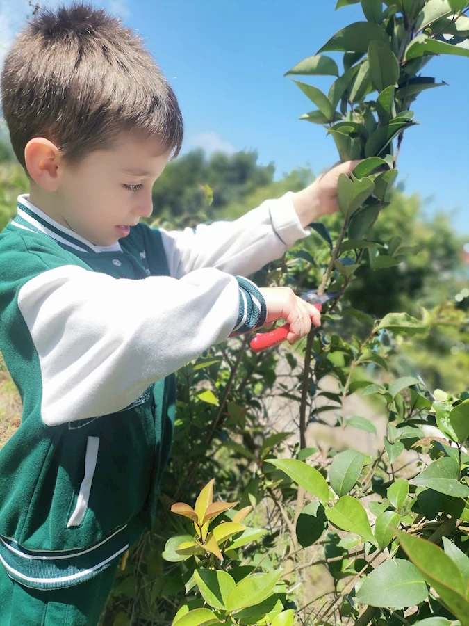 Öğrenciler, uygulama bahçesinde bulunan çit ağaçlarını budama makası kullanarak budayarak bahçe bakımına katkı sağladılar. Doğanın sesini dinleyerek başlayan öğrenciler, doğada spor yapmanın keyfini çıkardılar ve değirmende mısır öğütüp kümes hayvanlarını beslediler.