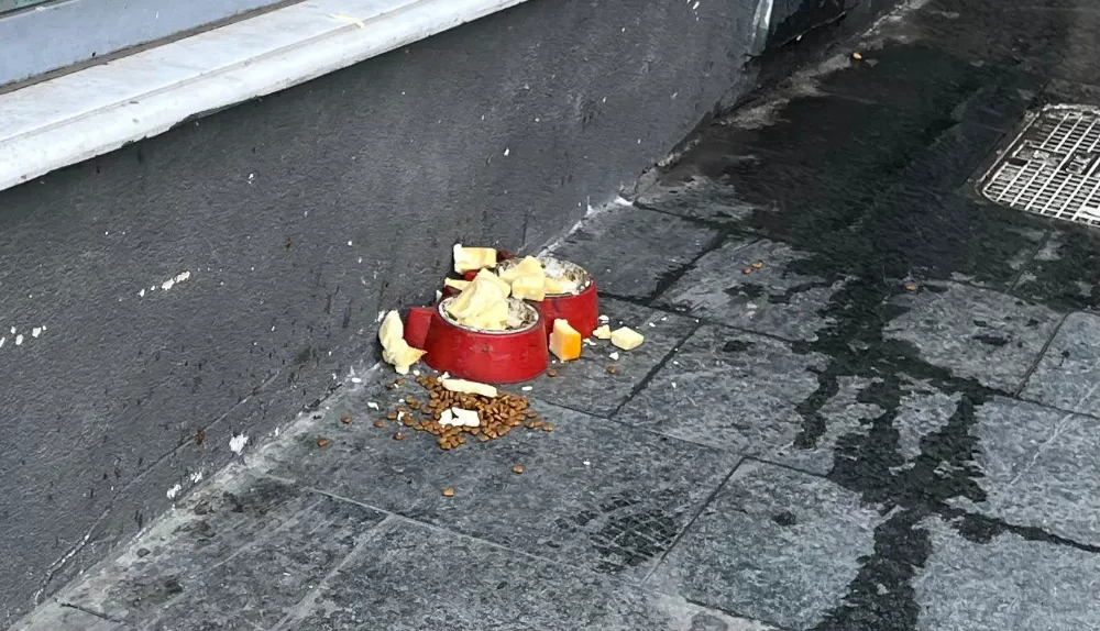 Akçaabat’ın en yoğun caddelerinden birinde kaydedilen görüntü dikkat çekti. Kaldırım kenarına bırakılan mama kapları ve gelişigüzel bırakılmış yiyecekler, çevrede dağınık ve istenmeyen bir görüntü oluşturdu.