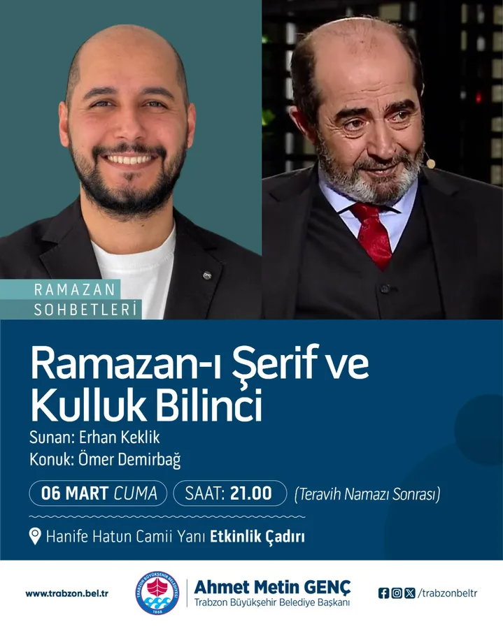 Teravih namazının ardından etkinlikler cami yanındaki çadırda sürecek. Saat 21.00’de düzenlenecek “İslam Yolculuğum” konulu söyleşi programında Ayla Aydemir moderatörlüğünde ünlü yazar Jenny Molendyk Trabzonlularla buluşacak. Sonradan Müslüman olan Kanadalı Molendyk, hayat hikayesini ve manevi yolculuğunu katılımcılarla paylaşacak. 6 Mart Cuma günü saat 21.00’de ise Erhan Keklik’in sunumuyla yazar ve şair Ömer Demirbağ, “Ramazan-ı Şerif ve Kulluk Bilinci” konulu söyleşide vatandaşlarla bir araya gelecek. Programlar kapsamında tasavvuf müziği konserleri de sanatseverlerle buluşmayı sürdürüyor.