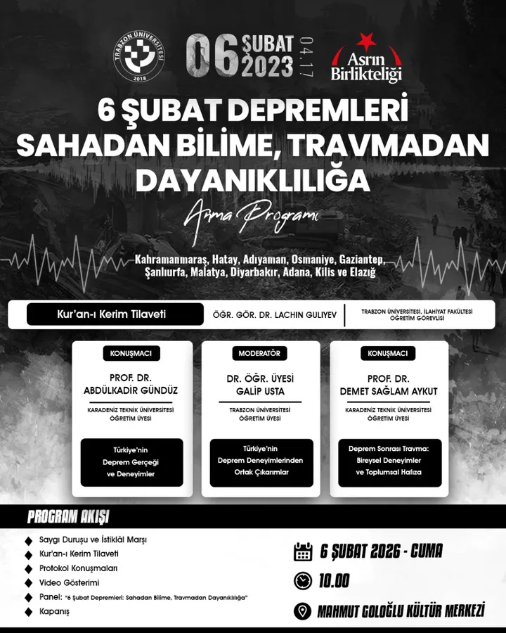 Trabzon Üniversitesi tarafından organize edilen “6 Şubat Depremleri: Sahadan Bilime – Travmadan Dayanıklılığa” başlıklı programda, Türkiye’nin ve bölgenin deprem gerçeği tüm yönleriyle ele alınacak. Kahramanmaraş merkezli ve 11 ili etkileyen depremlerin yıl dönümünde düzenlenecek etkinlikte, hem deprem şehitleri anılacak hem de yaşanan travmalardan çıkarılabilecek bilimsel ve toplumsal dersler tartışılacak.