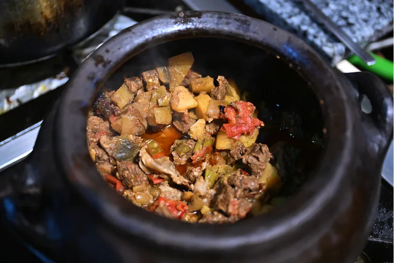 Güveçte yapılan yemeklerde farklı bir aroma oluştuğunu vurgulayan Şimşek, "Güveçte dana kuşbaşı, domates, patates, soğan, patlıcan, sarımsak, biber, salça, baharatlarımız var. İçine olmazsa olmaz giren lezzetlerden bir tanesi kuyruk yağıdır ve en son dibine de kuzunun döşünden ekleyeceğiz." diye konuştu.