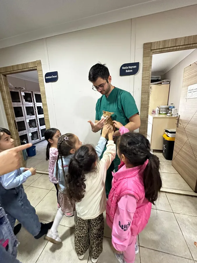 Veteriner hekim tarafından yapılan bilgilendirme sunumunun ardından minikler, klinikteki yaşam alanlarını gezdi. Ayrıca stetoskopla kedilerin kalp atışlarını dinleyen öğrenciler, klinikteki kedilere veteriner rehberliğinde yaş mama ile besleme etkinliği gerçekleştirdi.