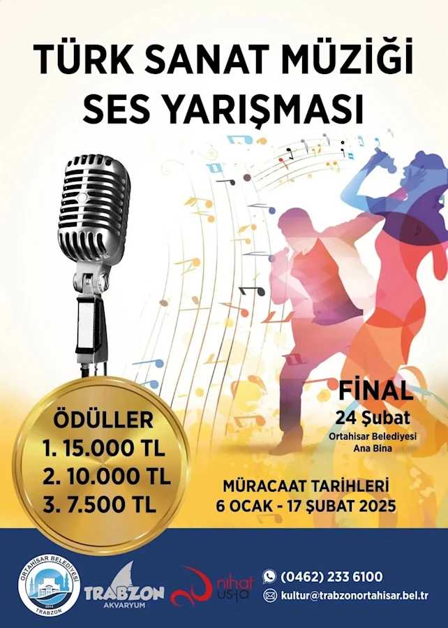 Yarışma başvurularının ön eleme tarihi olan 21 Şubat 2025’e kadar devam edeceği bilgisini paylaşan Başkan Kaya, “Bu yarışmayı ilan ettiğimiz günden bu yana 36 sanatseverimiz müracaat etti. Elemelerimiz 21 Şubat Cuma günü saat 14:00’de Belediyemizin ana binasındaki çok amaçlı salonumuzda gerçekleştirilecek ve seslendirilen eserler, TRT repertuarından olacak. Birinciye 15 bin lira, ikinciye 10 bin lira, üçüncüye 7 bin 500 lira ve mansiyon ödülüne layık görülen yarışmacıya da 2 bin 500 lira olmak üzere ödüllerimiz var. Tabi içinde bulunduğumuz sıkıntılı ekonomik tablo dolayısıyla bu etkinliği düzenlerken sponsorlarımızdan destek aldık. Belediyemize hiç külfet getirmeden bu etkinliği tamamlamış olacağız. Trabzon Üniversitesi Güzel Sanatlar Eğitimi Bölümü Müzik Eğitimi Anabilim Dalı Öğretim Üyesi Prof. Dr. Cahit Aksu, Öğretim Görevlisi Özlem Aydın, Öğretim Görevlisi İsmail Eraslan, T.R.T. İstanbul Radyosu Akitli Sanatçısı Vecdi Bülent Çiftçi, Trabzon Liselerinden Yetişenler Derneği sanatçı Köksal Yavuz jüri üyelerimiz olacak. Dereceye giren eserler için Trabzon’umuzun kurtuluş tarihinde final gösterisi gerçekleştirilecek” şeklinde konuştu.