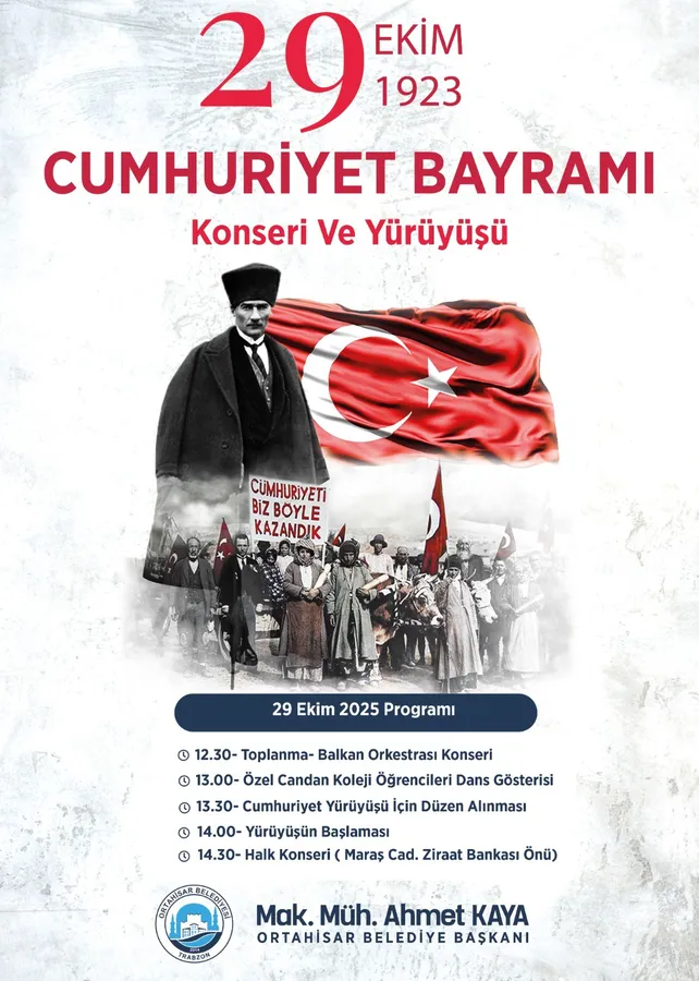 Vatandaşları Cumhuriyet Bayramı kutlama etkinliklerine davet eden Ortahisar Belediye Başkanı Ahmet Kaya, “Cumhuriyetimizin 102. yılını kutlamanın onurunu ve mutluluğunu yaşıyoruz. Bu topraklarda özgürlüğü, eşitliği ve demokrasiyi tesis eden Cumhuriyetimiz, bizlere Gazi Mustafa Kemal Atatürk’ün en büyük mirasıdır. Biz de bu emaneti, birlik ve beraberlik içinde, daha güçlü bir şekilde yarınlara taşımakla sorumluyuz. 29 Ekim’de hep birlikte, bayraklarımızla, coşkumuzla, inancımızla sokaklarda olacağız. Tüm hemşerilerimi Cumhuriyet yürüyüşümüze ve konser etkinliğimize katılmaya, Ortahisarımızda Cumhuriyet coşkusunu birlikte yaşamaya davet ediyorum” dedi.