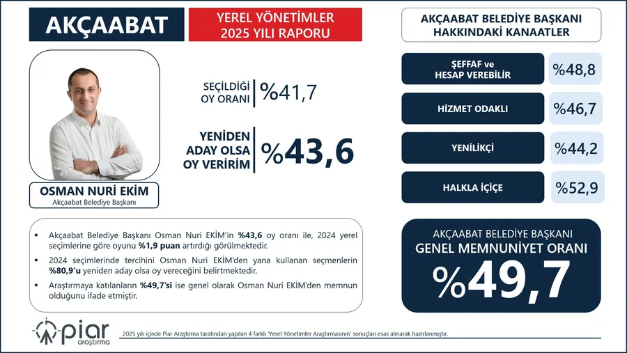 Piar Araştırma’nın 2025 yılı içinde yaptığı yerel yönetim araştırmalarına göre, Akçaabat Belediye Başkanı Osman Nuri Ekim’in hem seçmen memnuniyeti hem de güven oylarında artış gözlendi.
