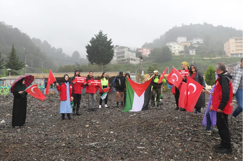 Çayeli ilçesindeki Limanköy Plajı'nda düzenlenen etkinliğe katılanlar, mehter marşı eşliğinde Türk ve Filistin bayrakları açtı.