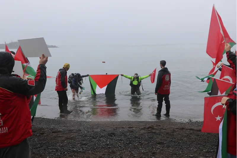 RİZE (AA) - Eğitim Araştırma Yardımlaşma ve Arama Kurtarma Derneği (ANDA) Trabzon İl Başkanı Yunus Ersoy ile ekip amiri Zafer Koçal, İsrail'in Gazze'ye saldırılarına dikkati çekebilmek için Karadeniz'de dalış gerçekleştirdi.