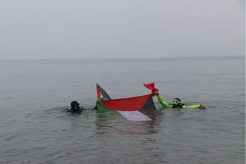 Bir süre deniz altında gezen Ersoy ve Koçal, Türk ve Filistin bayrakları açtı.