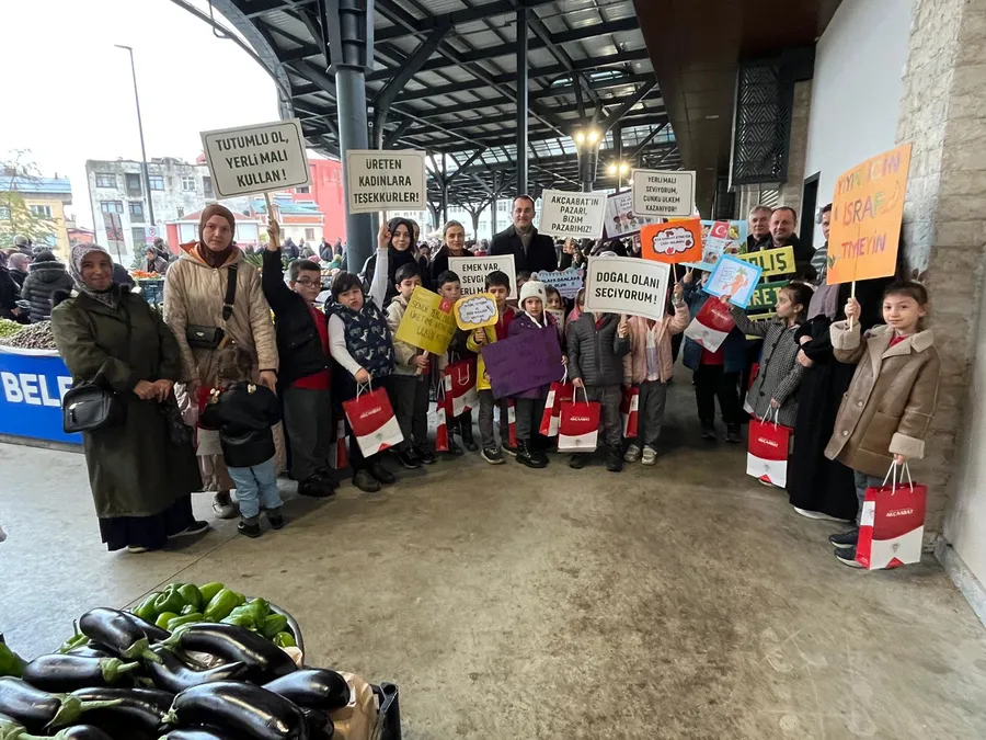 Atatürk İlkokulu’nun 2/A sınıfı öğrencileri, sınıf öğretmenleri Seda Şimşek nezaretinde, tutumlu olmayı ve yerli üretimi teşvik eden mesajların yer aldığı dövizlerle pazara geldi. Öğrencilerin taşıdığı dövizlerde “Ak akçe kara gün içindir”, “Sakla samanı gelir zamanı”, “Akçaabat’ın pazarı bizim pazarımız”, “Üreten kadınlara teşekkürler” gibi ifadeler yer aldı. Etkinlik, pazarcı esnafı ve vatandaşlardan da ilgi gördü.