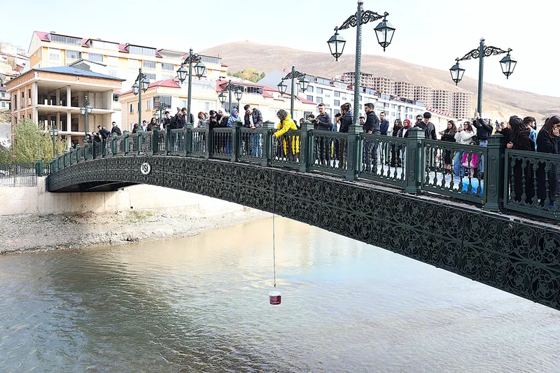 Kent merkezindeki Çoruh Nehri üzerinde yer alan DSİ köprüsüne gelen Erzincan Binali Yıldırım Üniversitesi Güzel Sanatlar Fakültesi Dekanı Prof. Dr. Kavukcu, köprü üzerinde boyadığı naylonu nehirden kovayla çektiği suyla temizledi.