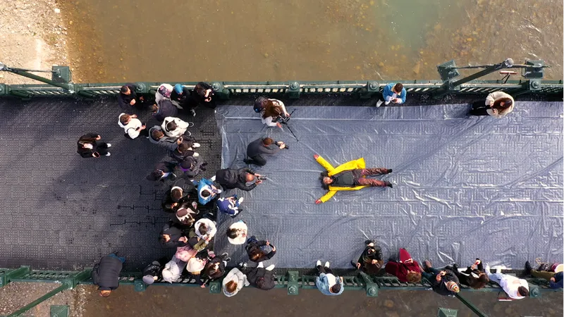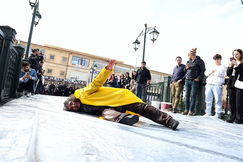 Daha sonra bedenine sardığı naylonla nehirden aldığı suyu üzerine döken sanatçı, performansıyla vatandaşların da dikkatini çekti.