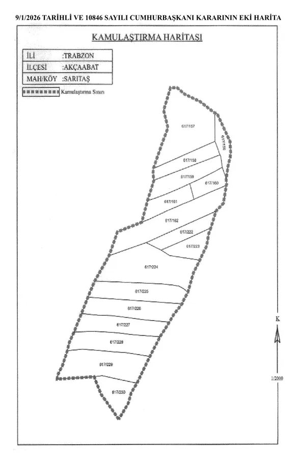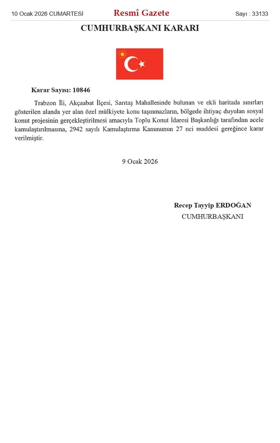 Resmi Gazete’de yer alan kararda, Trabzon’un Akçaabat ilçesi Sarıtaş Mahallesi sınırları içerisinde bulunan ve ekli haritada sınırları gösterilen özel mülkiyete ait taşınmazların, bölgede ihtiyaç duyulan sosyal konut projesinin gerçekleştirilmesi amacıyla Toplu Konut İdaresi Başkanlığı (TOKİ) tarafından acele kamulaştırılmasına karar verildiği belirtildi.