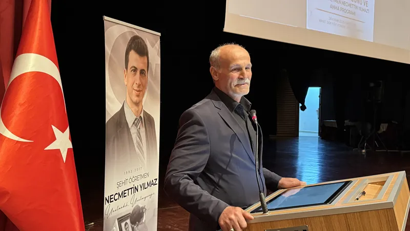 AÇÜ Rektör Yardımcısı Prof. Dr. Fikret Sözbilir, yaptığı konuşmada, şehit öğretmen Necmettin Yılmaz'ın hatırasının, öğretmenlik mesleğinin ne kadar fedakarlık ve adanmışlık gerektirdiğinin en somut göstergesi olduğunu söyledi.