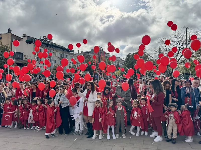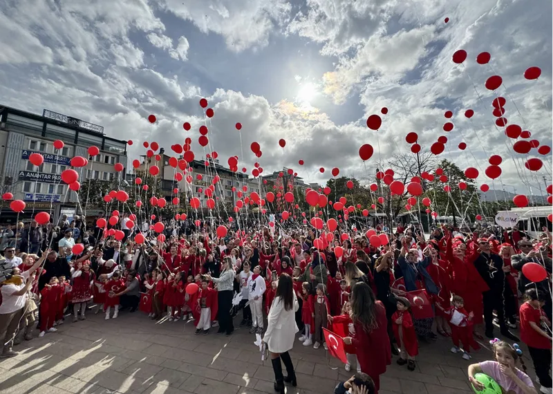 Gazi Caddesi'nden Atatürk Meydanı'na yürüyen çocuklar, gökyüzüne kırmızı balonlar bıraktı.