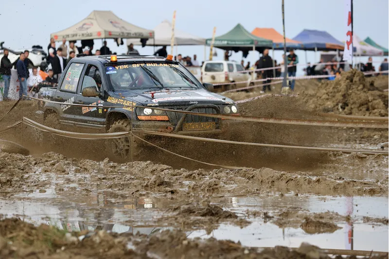 İlçe stadının yanındaki alanda düzenlenen festivalde, çamurlu parkurda zorlu engelleri geçerek ilerleyen ekipler, yarışı en kısa sürede bitirmek için mücadele etti.