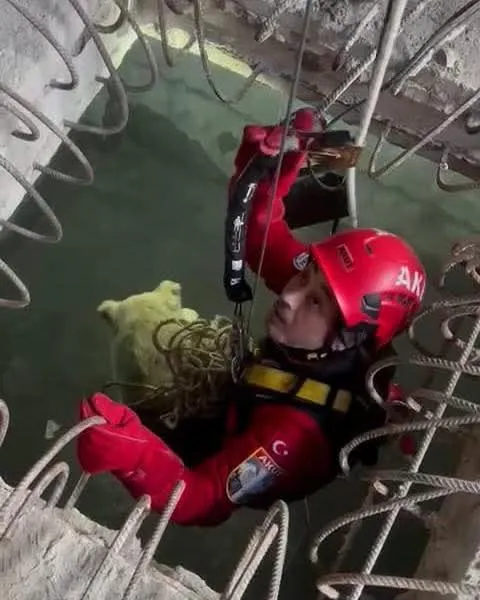 Kurtarma çalışması başlatan ekipler, halat yardımıyla indikleri çukurdaki köpeği mahsur kaldığı yerden çıkardı.