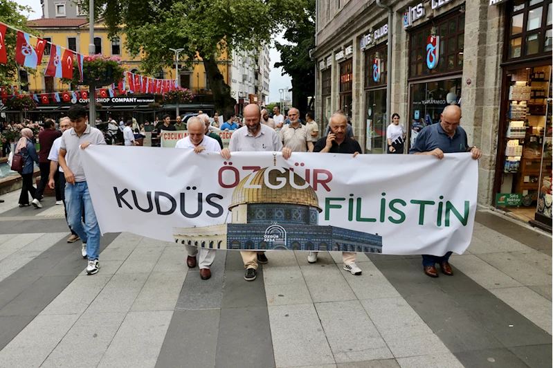İlçedeki İskenderpaşa Camisi önünde bir araya gelen Özgür Aksa Trabzon Platformu üyeleri, ellerinde Türk ve Filistin bayraklarıyla slogan atarak Kahramanmaraş Caddesi'ndeki Ziraat Bankasının önüne yürüdü.