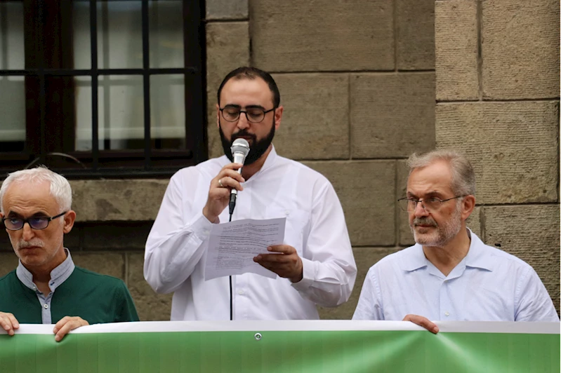 Burada grup adına açıklama yapan Kadir Bekar, Gazze'de yaklaşık 2 yıldır yaşanan zulmün dünya kamuoyunu yöneten güçlerin umursamazlığıyla daha kötü bir hale geldiğini söyledi.