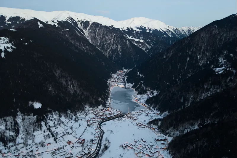 Uzungöl ve çevresindeki karla kaplı ormanlar dron ile görüntülendi.