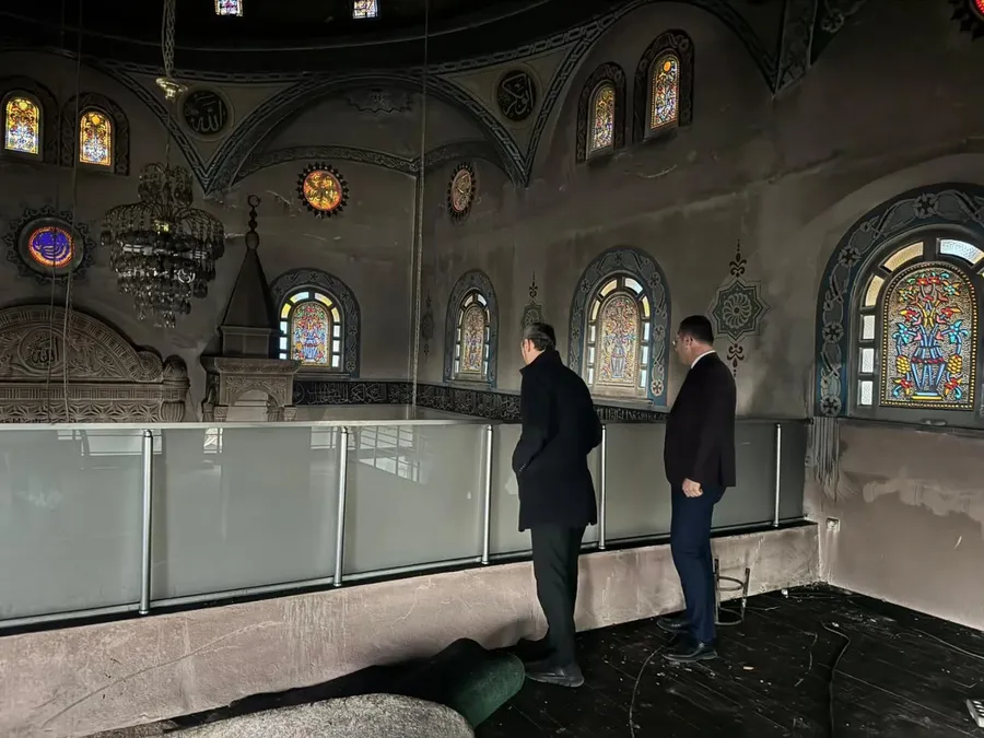 çıkan yangın sonucu büyük hasarın meydana geldiği Kavaklı Mahallesi Güney Mevkii Merkez Camii’nde incelemelerde bulundu.