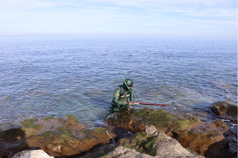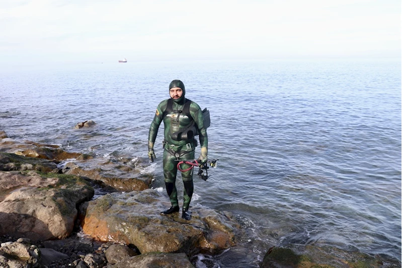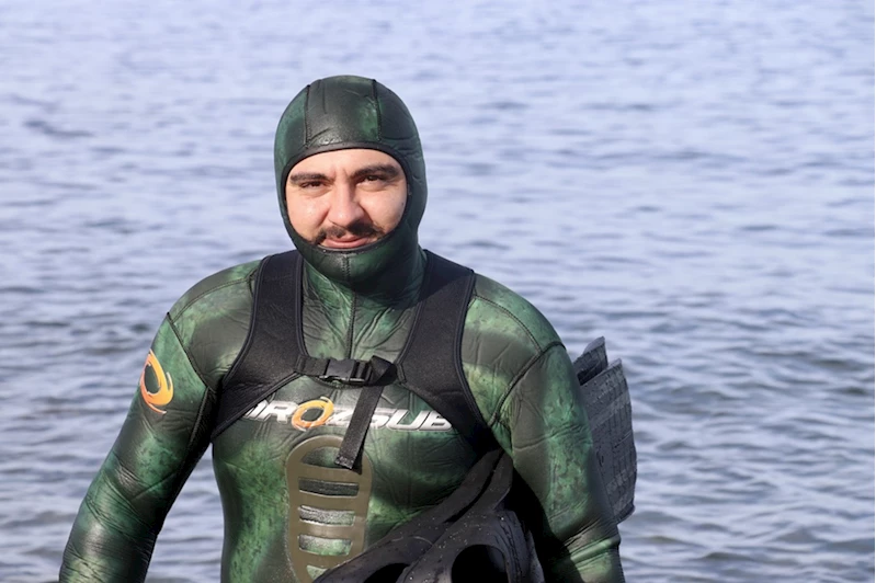Hafızoğlu, suyun derecesi ve rüzgar gibi hava koşullarını takip ederek genellikle Akyazı sahilinden özel kıyafetleri ve zıpkınla dalış yapıyor.