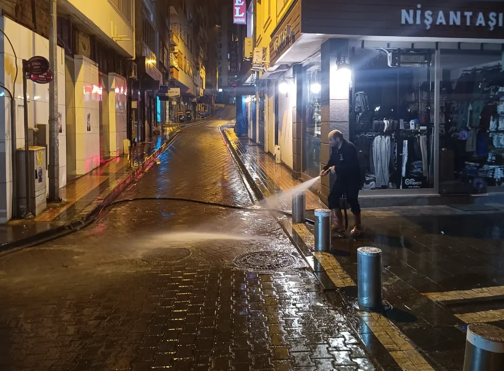 Gecenin ilerleyen saatlerinde başlayan çalışmalar kapsamında, temizlik araçlarıyla sokaklar yıkanıyor. Ekipler, şehirdeki ana cadde ve ara sokakları dolaşarak, çöp ve pislikleri temizleyip suyla yıkama işlemi gerçekleştiriyorlar.