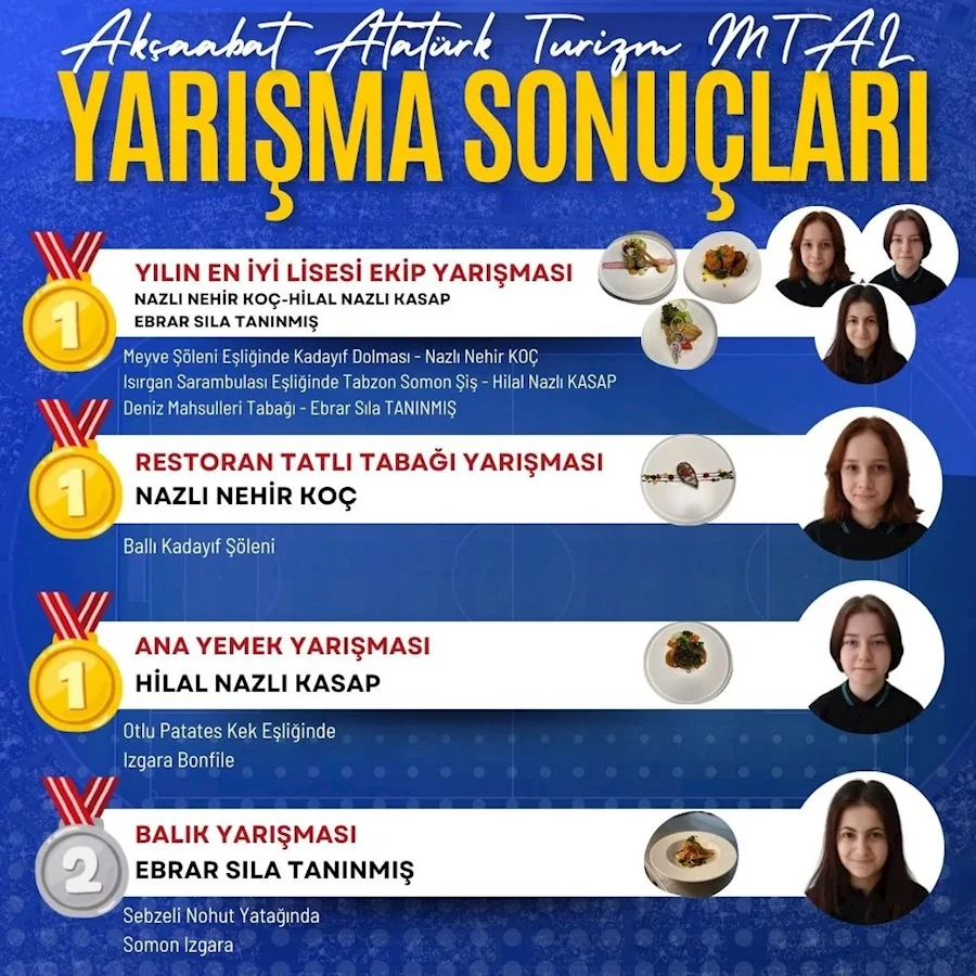 Türkiye Aşçılar ve Şefler Federasyonu (TAŞFED) ve Dünya Aşçılar Birliği (WACS) işbirliğiyle İstanbul-Şile’de düzenlenen 21. Uluslararası İstanbul Gastronomi Festivalinde büyük bir başarıya imza atan Akçaabat Atatürk Mesleki ve Teknik Anadolu Lisesi öğrencileri için ödül töreni düzenlendi. Öğrenciler, yarışmada 3 Altın ve 1 Gümüş Madalya kazanarak tarihi bir başarıya imza attılar.