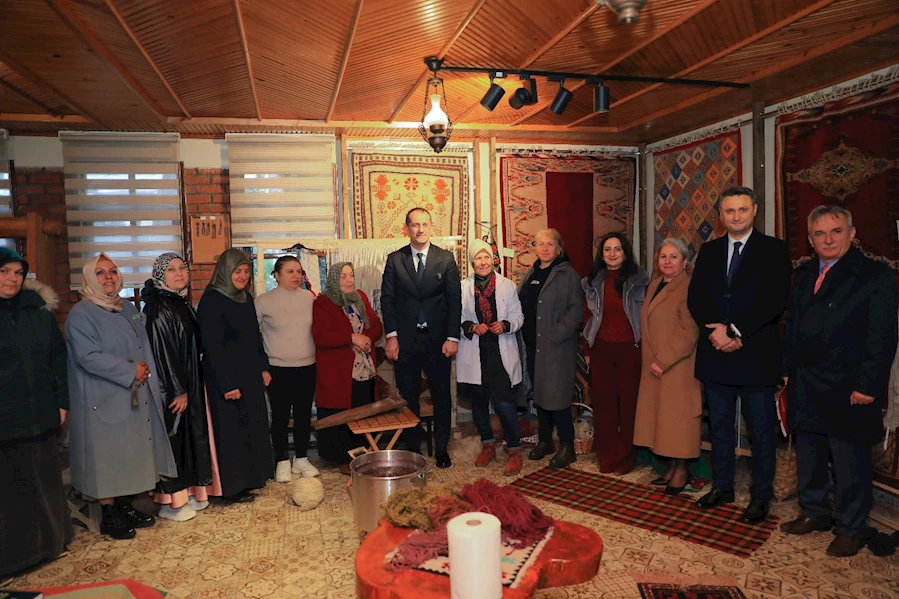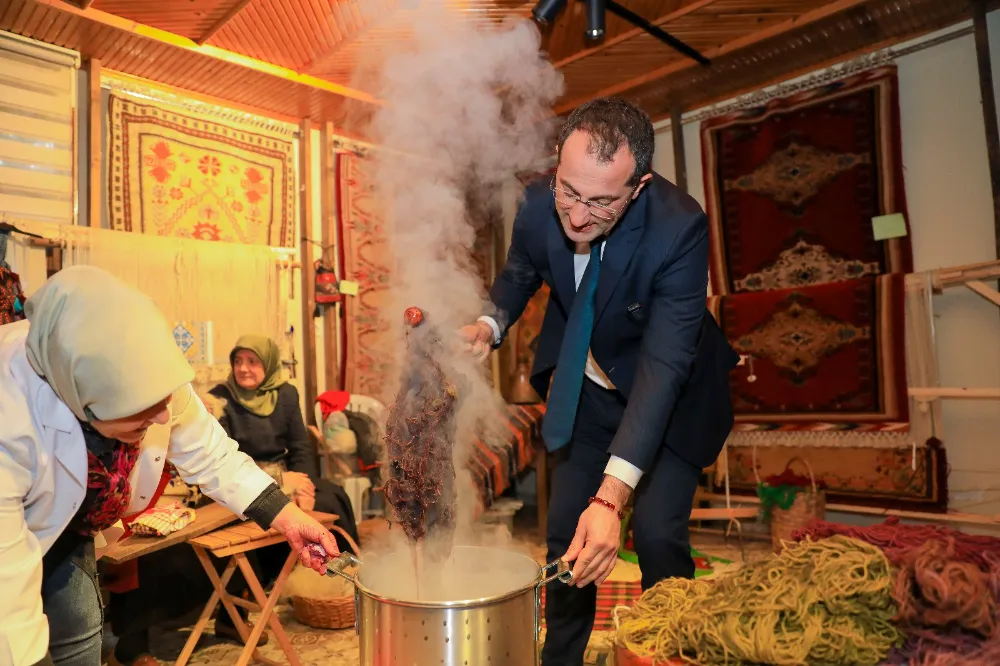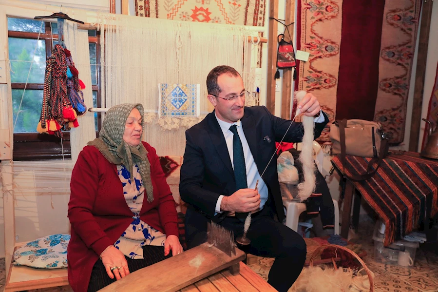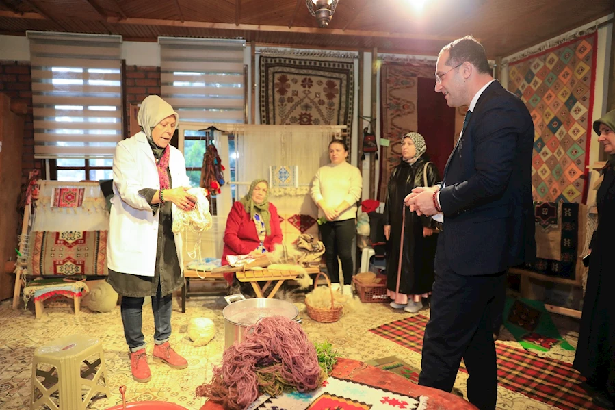 Koyun yünlerinin temizlenip taranmasıyla başlayan süreç, ipliklerin eğrilmesi ve doğal boyalarla renklendirilmesiyle devam etti. Başkan, ipliklerin aronya boyasıyla buluştuğu aşamada renklerin nasıl hazırlandığını bizzat izledi. Ladin bitkisi ve tuz kullanılarak boyaların nasıl sabit hale getirildiğini öğrenirken, şurup hazırlama sürecinde karışıma kendi elleriyle katkıda bulunmayı da ihmal etmedi.