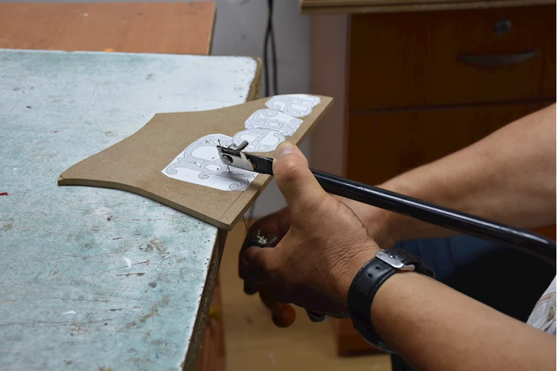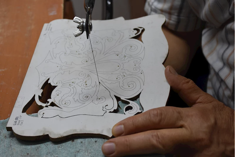 "İlimizde gürgen ve ceviz ağacı bulmak kolay ancak çalıştığım kalınlık yaklaşık 6 milim. Onu burada bulmak zor oluyor. Onun için ağaç parçalarının yüzde 80'ini Bursa'dan getirtiyorum. Modeller konusunda bir arşivim var. Türkiye genelinde bu işi yapan arkadaşlarla paslaşıyoruz, modeller değiştiriyoruz. Çizilen modelimizi üzerine yapıştırıyoruz, motifleri tek tek deliyoruz ve kesiyoruz. Bir modeldeki motif için o deliğe en az 4 kez işlem yapıyorum, delme, kesme, zımparalama ve cilalama olarak. Bir modelde bin tane delik varsa, ben her bir motife 4 işlem sonucu 4 bin kez gitmiş oluyorum."