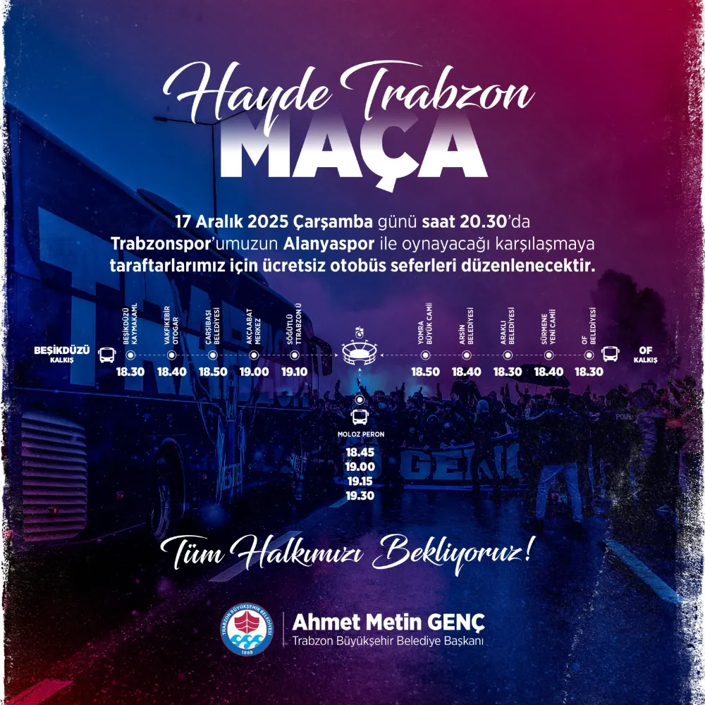 Trabzon Büyükşehir Belediyesi, bu akşam Akyazı Stadı’nda oynanacak Trabzonspor-Alanyaspor Ziraat Türkiye Kupası karşılaşması için taraftarların stadyuma ulaşımını kolaylaştırmak amacıyla ücretsiz otobüs seferleri düzenleyecek. Saat 20.30’da başlayacak maç öncesinde ulaşımda aksama yaşanmaması için batı ve doğu ilçelerinden seferler planlandı. Buna göre, Beşikdüzü Kaymakamlığı önünden 18.30, Vakfıkebir Otogarı’ndan 18.40, Çarşıbaşı Belediyesi önünden 18.50, Akçaabat merkezden 19.00 ve Söğütlü Trabzon Üniversitesi önünden 19.10’da otobüsler hareket edecek. Doğu ilçelerinden ise Of Belediyesi önünden 18.30, Sürmene Yeni Cami mevkiinden 18.40, Araklı Belediyesi önünden 18.30, Arsin Belediyesi önünden 18.40 ve Yomra Büyük Cami önünden 18.50’de seferler düzenlenecek. Ayrıca Moloz peronundan da 18.45, 19.00, 19.15 ve 19.30 saatlerinde ek otobüs seferleri gerçekleştirilecek. Trabzon Büyükşehir Belediyesi’nden yapılan açıklamada, “Amacımız, Trabzonspor’umuza gönül veren tüm taraftarlarımızın müsabakayı coşku ve heyecan içinde takip edebilmesi için ulaşımı sorunsuz hale getirmektir. Tüm taraftarlarımıza keyifli ve güvenli bir maç günü diliyoruz” denildi.